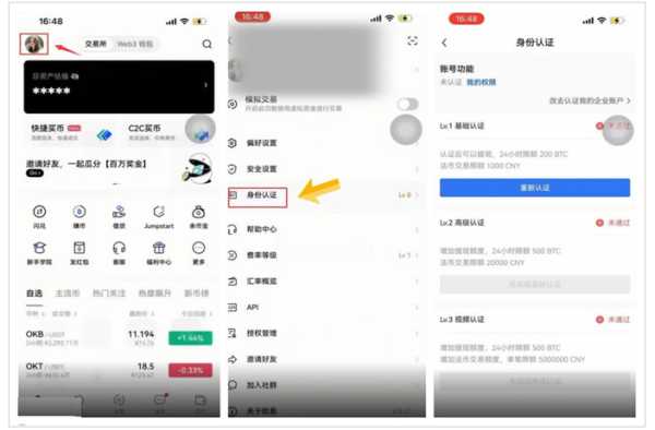 3.先验证身份(KYC验证)才可进行交易,点击左上角的【个人中心】——进入【身份认证】页面,按照页面提示完成LV.1基础认证、LV.2高级认证和LV.3视频认证。