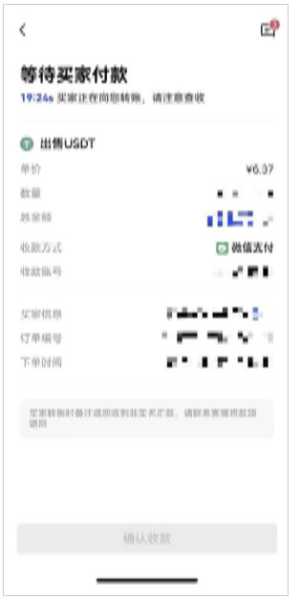 5.等待买家付款,待确认收款点亮后即表示对方已付款,请务必登录手机银行或网银等查看到账情况,确认钱款到账后,尽快点击【确认收款】将数字资产发放给买家即可。