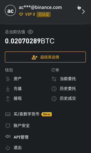 在登录到您的币安帐户之后,将鼠标移动到右上角并悬停在配置文件的图示上。显示结果对于每个人将会不同,您将会看到您电子邮件地址的前两个字符。当下拉菜单打开后,点击您的电子邮件来进入您的账户面板。