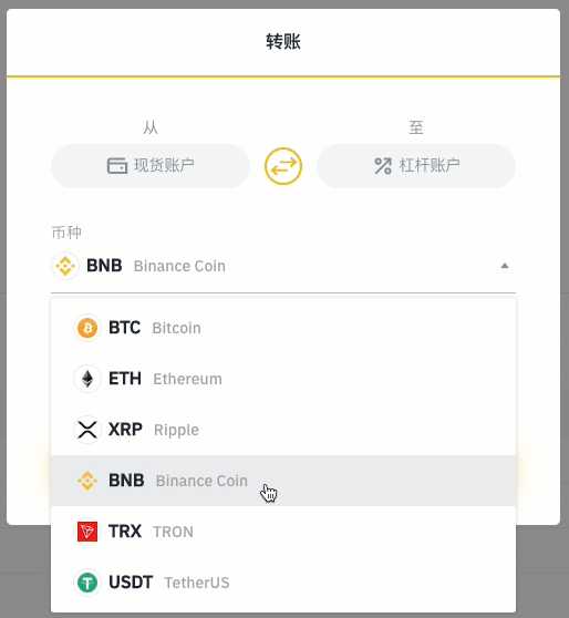 下一步就是选择您想要进行转移的代币。在此例中我们将使用币安币(BNB)。