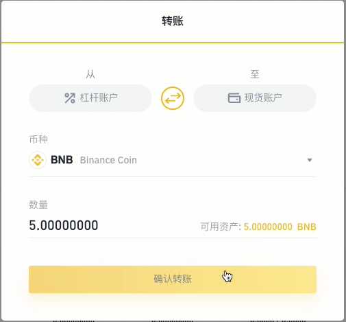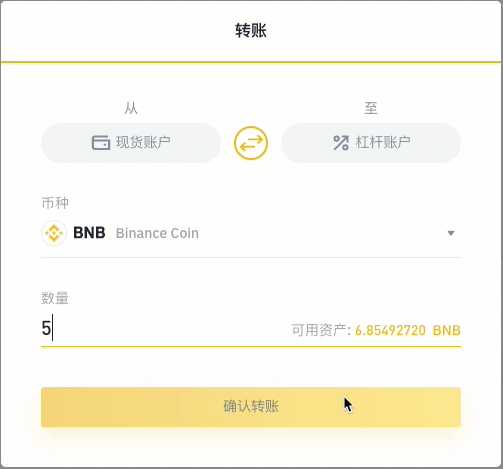 如果您想要将资金从杠杆交易钱包中转回常规币安钱包中,点击“转账”并使用两个钱包中间的转换按键来更改转账方向。之后选择代币类型以及金额并单击“确认转账”。