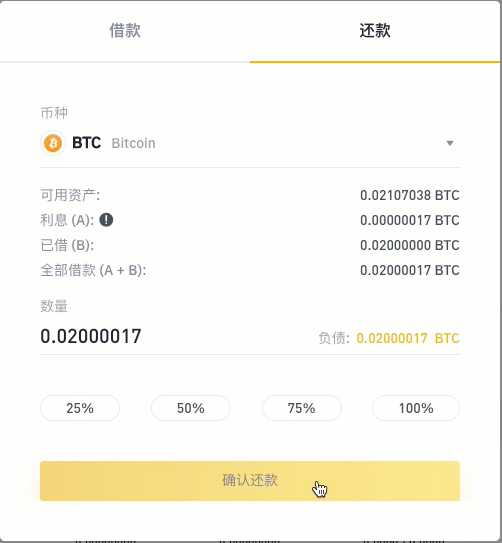 您需要支付的金额是借款总额加上利息的总和。在进行操作之前,您的余额要达到所需的金额。在准备好所需资金后,选择想要偿还的代币以及金额,之后点击“确认还款”。同时还请注意,利息将会被率先支付,且您只能使用相同的加密货币进行还款。