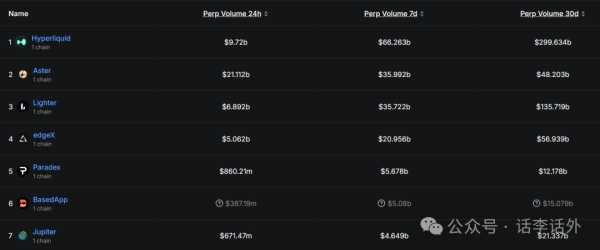就加密市场而言,其实每隔那么几个月的时间,基本都会出现一些新的叙事机会,比如,近期 Perp DEXs(链上永续合约)的叙事又火了,近 7 天交易量超过百亿美元的就有 4 个项目,包括了 Hyperliquid、Aster、Lighter 和 edgeX 。如下图所示。