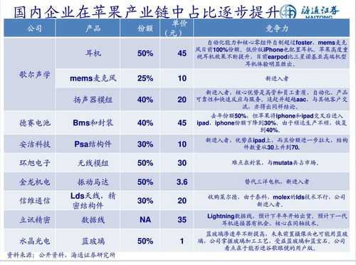 苹果产业链概念一览: 晶盛机电、天龙光电、安泰科技、欧菲光、露笑科技、天通份、东晶电子、大族激光、立讯精密、华工科技、水晶光电、锦富新材、歌尔声、环旭电子、安洁科技等。 环旭电子:微小化模组率先受益苹果穿戴式新品 研究: 业绩简评 环旭电子发布14 年1 季报,1-3 月实现收入34.76 亿元,与去年基本持,净利润11,173.98 万元,同比下降5.9%;对应EPS0.16 元,基本符合预期。 经营分析 经营超预期,毛利率企稳升:去年高基数影响,营业收入与去年基本持,要好于市场对公司整业绩的预估;毛利率12.9%虽然较去年同期下降0.6 个百分点,但已经较去年均水11.9%提升1 个百分点,显示经营的稳定增长。 产业链做到,级模组新品供应穿戴式新品:公司微小化无线通讯模组产品是的供应商之一,去年苹果才引入TDK 作为第三家供应商,其微小化技术在来看处于的地位;iWatch 等巨穿戴式产品的发布,将拉开新一代设备硬件创新的大幕,公司相应的微小化产品将有望率先切入供应链,并且获得更大的市场份额。 背靠日元光,技术衍进方向更为明确:作为日月光的子公司,公司可以在战略布局与技术演进方面,获得更多的资源与技术交流,看好公司在SMT层面,日月光在半导制程层面完善级封装,形成互补。 估值与投资建议 研报认为随着苹果iWatch 推出时点的临近,穿戴式设备终于迎来硬件巨的指引,成熟进程有望大幅加快。公司作为SIP 技术的厂商,有望率先享受新品增长带来的红利。提升公司14-17 年盈利预测为0.77 元、0.89元、1.03 元;若考虑募投项目贡献以及份摊薄,对应EPS 分别为0.727元、0.922 元、1.118 元,维持“增持”评级,目标价为28 元,对应30x15PE. 风险 公司产品生产销售低于预期。 锦富新材:一季度营收增速恢复,新的利润增长点将逐步显现 研究:中金公司日期:2014-4-29 业绩略低于预期 锦富新材1Q14 实现营收6.0 亿元,同比上升28%;归属于上市公司东净利润4,316 万元,同比增加20%,小幅低于市场预期。 2013 毛利率大幅下降,参公司DS 经营恶化:4Q13 营收同比增速为10%,带动2013 全年实现4%营收增速。其中内销增长较快,2013 年同比增长47%,在营收中占比提升至45%。受行业竞争加剧影响,2013 毛利率同比下降3.6 个百分点至15.7%。DS 经营持续恶化而计提长投减值准备1,094 万元,加上对应收账款计提2,282 万的坏账,2013 归属于上市公司净利润同比下降33%。 1Q14 营收增速恢复,营业外收入大幅增加:1Q14 营收恢复28%同比增速,但毛利率维持向下趋势,为13.9%,同比下降5.6 个百分点,使得1Q14 毛利同比减少9%。三大营业费用率从4Q13的6.8%下降至5.3%,营业外收入同比增加252%,使得税前利润实现3%的同比增速。 发展趋势 2013 产品结构调整与布局,2014 有望逐渐收获新的利润增长点:2013 公司不断拓展外延,收购DS 获得三星LCM 和BLU 合格供应商资格;消费电子镜模组项目已完成产线建设并量产;CNC(数控加工中心)项目新的研发及生产基地在建中,用于OGS玻璃加工的设备已实现小批量供货,用于蓝宝石玻璃加工的设备已完成研制并将交付重点客户试用;增资苏州格瑞丰涉足石墨烯领域,着力电子新型材料、3D 印工艺及设备研制,目前已接到客户研发订单。 切入地图开发新领域,推动软硬件一化:公司联合研发“捷径全景全息地图综合应用”,加强对消费电子产品应用软件及服务的储备。目前该项目研发顺利,并着引进的游戏及商业应用合作方,未来将进一步加大力度拓展“内容”服务领域。 盈利预测调整 下调2014EPS 至0.42 元(-15%),源于毛利率的大幅下降,2015EPS为0.49 元。结合公司近两年PE(TTM)均值减去0.5 倍标准差(30x),给予目标价12.5 元(-18%)。 估值与建议 当前价对应2014/15 年市盈率为25.2x/21.7x,维持审慎推荐评级。风险在于并购收益未能快速现、新项目进度低于预期。 安洁科技:业绩符合预期,新品季启动 研究:申银万国日期:2014-4-25 重申买入评级。尽管一季度由于苹果iPad 出货量下滑导致公司业绩不佳,但是考虑到2Q 开始苹果新品驱动的产品单价及盈利能力提升,研报维持公司2014-16 年盈利预测为1.20 元,1.79 元,2.53 元,目前对应14-16 年PE为29.3X,19.6X 和13.9X,考虑公司未来持续受益于客户新品推出和新材料布局,研报认为公司未来将持续保持高速增长,6 个月-12 合理估值水为14年40 倍PE,对应6-12 个月目标价48 元,重申买入评级。 1 季报符合研报预期,盈利能力下滑。公司14 年1 季度实现营业收入1.45 亿,同比下滑11.6%,环比下降26.4%,归属上市公司东净利润3052 万,同比下滑31.4%,环比下降19.2%,对应EPS 0.17 元,符合研报的预期。1 季度公司毛利率30.3%,比13 年1 季度毛利率下降10.5 个百分点,比13 年4 季度下降4.5 个百分点。公司1 季度三项费用合计1351 万,同比减少18.5%,环比减少25.6%。盈利能力变化主要是由于相比去年同期,14 年1 季度新产品尚未量产,而iPad 出货量下滑导致公司开工率降低,影响了公司的盈利能力。 2 季度开始受益苹果新品效应。研报预计公司将从2 季度开始供货Macbook 新品,随着2Q 末iPhone 6 及大尺寸iPhone 量产,4Q 大屏iPad Pro 量产,公司可望显着受益于新品带动的盈利能力。研报认为特别需要关注的是新品中公司提出的新材料和新设计应用可望大幅提升公司对客户产品的单价。 新产能可望2Q 末投产,大幅公司经营效率。公司目前投资的光电车间扩产项目和重庆安洁可望与2Q 末至3Q 初投产,可望大幅提升公司的制造规模,公司接单能力,并
