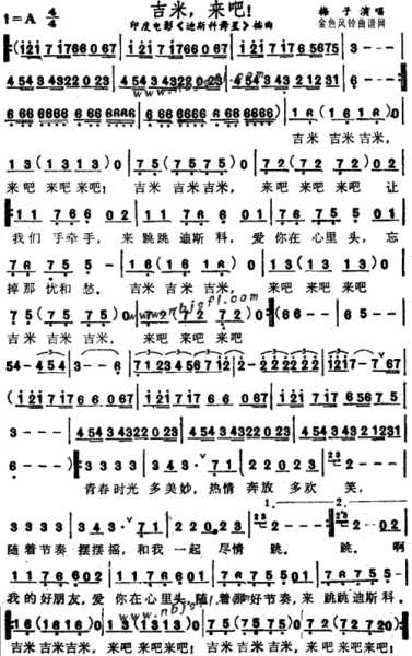 印度影片《迪斯科舞星》的主题歌“吉米,吧以下是中文歌词, 李玲玉演唱过 吉米,来吧!吉米,来吧! 让我们牵,来跳跳迪斯科, 爱你在心里,忘掉那忧和愁. 吉米,来吧!吉米,来吧! 让我们牵,来跳跳迪斯科, 爱你在心里,忘掉那忧和愁. 吉米,来吧!吉米,来吧! 青春时光多美妙,热情奔放多欢笑, 随着节奏摆摆摇,和我一起尽情跳. 啊我的好朋友,爱在心里, 随着那好节奏,来跳跳迪斯科. 吉米,来吧!吉米,来吧! 啊我的好朋友,爱在心里, 随着那好节奏,来跳跳迪斯科. 吉米,来吧!吉米,来吧! 在的火热旋律中含蓄着的国度 在佛号的单调旋中乐观着的国度 孕育着许许多多这样的女人 印象中印度的女人 一律的露着肚皮明眸和纤 在音乐中优雅着表达 于是我们更多记得她们是印度的 而忽略了其实她们 其实先是美艳动人的女人