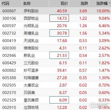 2.光明乳业 (600597): 光明乳业份有限公司是由国资、外资、民营资本组成的产权多元化的份制上市公司,主要从事乳和乳制品的开发、生产和销售,奶牛和公牛的饲养、培育,物流配送,营养保健食品的开发、生产和销售。公司拥有世界的乳品研发中心、乳品加工设备以及先进的乳品加工工艺,形成了奶、保鲜奶、酸奶、温奶、奶粉、黄油干酪、果汁饮料等系列产品,是目前国内规模的乳制品生产、销售企业之一。2011年7月3日,在经营论坛上,光明乳业总裁郭本恒表示,生乳标准几乎是全世界最差。对此言论,其他乳业巨称不予评价。