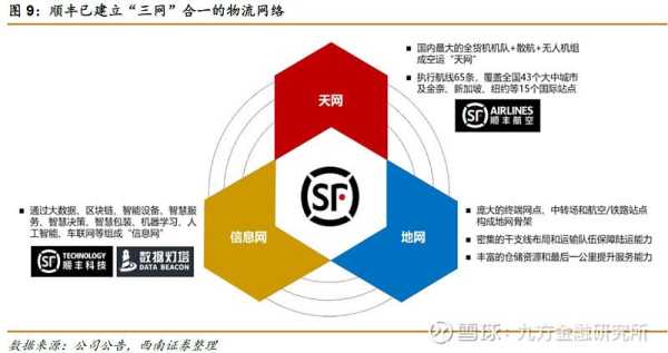 三网合一: 天网、地网、信息网。 经过多年潜心经营和前瞻性战略布局,顺丰已形成拥有天网、地网、信息网的,可覆盖国内外的综合物流服务。