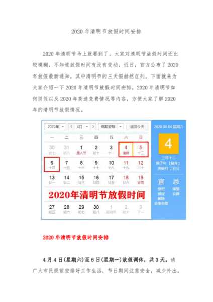 >2020年清明节放假时间:4月4日~6日,放假3天;与周末连休。