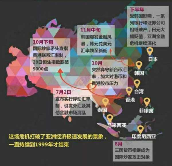 自1997年初起,东南亚地区特别是泰国的泰铢受投机者的攻击,泰铢不断走软,最终不得不放弃固定汇率制,造成泰铢狂跌。接着菲律宾、马来西亚和印尼3国的货币也狂跌。
