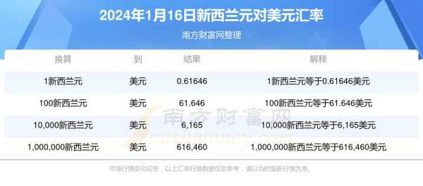 货币兑换1新西兰元=4.90291=0.2040新西兰元10000新西兰元=49029.2491以上为银行汇率信息,供参考。交易时请以银行柜台成交价为准。