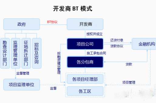 BT是Build(建设)和Transfer(转让)两个英文单词的缩写,其含义是:通过合同约定,将拟建设的某个基础设施项目授予企业法人投资,在规定的时间内,由企业法人负责该项目的投融资和建设,建设期满,按照等价有偿的原则向企业法人协议收购的商业活动。BOT是英文Build-Operate-Transfer(建设、经营、转让)的缩写。从内容上看,BOT是一种适用于基础设施建设的投资、融资方式。BOT投融资模式的典型形式是:项目所在地授予一家或几家私人企业所组成的项目公司特许权利——就某项特定基础设施项目进行筹资建设,在约定的期限内经营管理,并通过项目经营收入偿还债务和获取投资报;约定期满后,项目设施无偿转让给所在地。