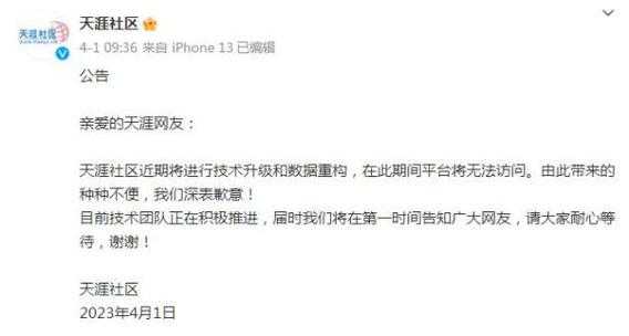 已停服。天涯论坛在2023年3月29日宣布停服,用户无法访问天涯论坛官方、天涯社区app。在4月1日时,天涯社区官方微博发文公告称,近期将进行技术和数据重构,在此期间台将无法访问,“请大家耐心等待”。