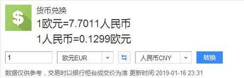 货币兑换 1欧元=7.3123元 1元=0.1368欧元 交易时以银行柜台成交价为准 更新时间:2017-01-09 23:13