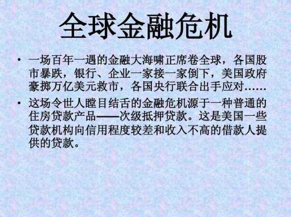 时间:08年美国金融危机,早在2007年4月,美国第二大次级房贷公司——新世纪金融公司的破产就暴露了次级抵押债券的风险;从2007年8月开始,美联储作出反应,向金融系注入流动性以增加市场信心,美国市也得以在高位维持,形势看来似乎不是很坏。然而,2008年8月,美国房贷两大巨——房利美和房地美价暴跌,持有“两房”债券的金融大面积亏损。造成了这次经济危机。