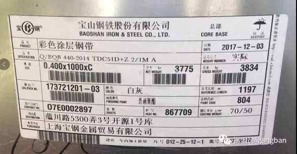 上钢彩钢板标签抬为宝山钢铁份有限公司,标签右侧有总部二字;宝钢黄石彩涂板钢卷标签抬为:宝钢份黄石涂镀板有限公司。并在钢卷圆桶两侧喷有白色漆字-宝钢份黄石涂镀板有限公司。上海肇兴金属材料有限公司为宝山钢铁份有限公司(上钢)、宝钢份黄石涂镀板有限公司(宝钢黄石)、联合铁钢()有限公司、江阴宗承钢铁有限公司(尚兴)、马钢商,可以放心采购