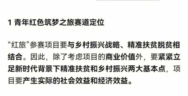 >>>“红旅”参赛项目要与乡村振兴战略、精准扶贫脱贫相结合。因此,除了考虑项目的商业价值外,要紧紧立足新时代背景下精准扶贫和乡村振兴两大基本点,项目要产生实际的社会效益和经济效益。