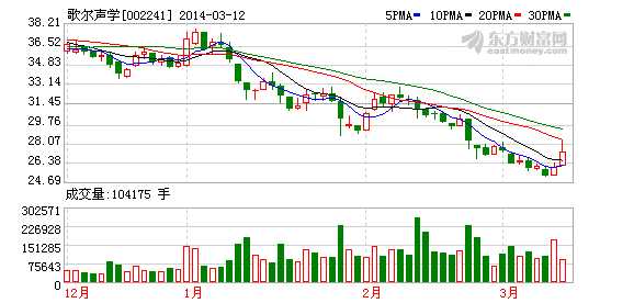 所属板块:基金重仓板块,重仓板块,深成500板块,送转除权板块,转融券板块,穿戴板块,电视板块,苹果概念板块,LED板块,山东板块,电子元件板块,HS300_板块,融资融券板块,央视50_板块。公司名称:歌尔声份有限公司英文名称:GoerTekInc。A代码:002241,A简称:歌尔声,证券类别:深交所中小板,A所属行业:电子元件