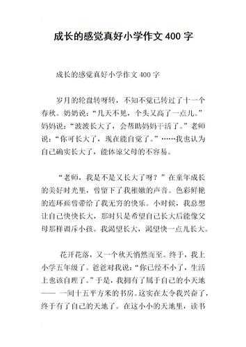 在我成长的道路上 时光飞逝,日月如梭。转眼间,我已经十岁了,想起成长道路上的点点滴滴,我的心中不断地泛起涟漪。在我成长的道路上有许许多多的事,有高兴的、有伤心的 、有奇妙的、有常的,在这些事中,最令我难忘的是我习滑滑板,因为从这件事中,我明白了耕耘才会有收获。 一个月前,姥姥给我买了一个滑板,那个滑板是我的颜色――天蓝色,它有一个非常好听的名字叫“漫步者”。我见了,爱不释,高兴得舞足蹈,迫不及待地拉着妈下楼试滑。我模仿其它同,先把左踩在前踏板中间,后也想踩在后踏板中间,可后怎么也上不去,后一动,滑板就歪了。我很着急,也很害怕,我抓住妈双,小心翼翼地踩上滑板,向前滑动。“啪”的一声,我失去衡,一下子扑进了妈怀里。妈妈把我扶起来说:“不要慌,要慢慢练,心急不了热豆腐。”妈妈一句坚定而鼓励的话,让我增添了勇气。于是,我又试了一次,“好,上去了。”随着妈话音,我的两条腿直直地站在了滑板,但双腿在微微地颤抖,我的心也怦怦地乱跳,刚滑了几米,唉,我又摔了。“别着急,你要慢慢练习,多练才能滑好。欲速则不达。抬挺胸,身舒展了,姿势才能正确……”妈妈不厌其烦得说着,拉着我的双也慢慢的放松了。就这样,在妈帮助下,我克服了害怕的心理,一遍遍的认真练习,功夫不负有心人,终于,我轻松自如地站在了滑板,可以滑行了。上、下板也轻如燕子,只是速度提高不了。我又经过一次次的失败,一次次的练习,摔倒了再爬起来,落板了再重新上板,我终于成功了!现在我已经可以非常轻松地玩滑板了。速度也增快了许多,还可以在滑行的过程中蹲下捡东西。 习滑板的事情,让我懂得了耕耘才会有收获,谁都不可能不练习就能成功,成功是靠劳动和不怕疼、不怕苦的精神换来的。第二篇: 在成长的道路上在世界上,无论是城市的宽广大道,还是乡村的林间小道路,在我们的下,都引导着我们向前进。而在我成长的道路上,妈妈就是我的引。在我上三年级的时候,有一次我拿了储钱罐的10元钱买了对习无关的书。没过多久,就被妈妈给发现了。这天,妈妈走到我的面前,对我说:“璇璇,妈妈知道你拿了钱,告诉妈妈,你用钱干什么了?”听了妈话,我的脸“刷”的一下红了,好像一个熟透了的大红蕃茄。心里七上八下地,就像揣了一个小兔子。我吞吞吐吐地说:“我---我没---没拿”。妈妈听后,十分失望,眼中流露出了几分悲哀。妈妈对我说:“一个人可以何东西,但是唯独不能没有诚实。你小小年级就撒谎,这使妈妈我心,你知道吗!”妈话就像钢针一样深深地刺了我的心。我再也忍不住了,抱着妈妈说:“我拿了!我拿了!我用钱买了两本漫话书!”泪水不由自主地流了出来。妈妈替我擦去了泪水,说:“孩子,你终于说实话了。这件事已经过去了,妈妈就不再追究了,不过,你要向妈妈保证不再重放,要诚实,好吗?”我点点。妈妈欣慰地笑了。在我成长的道路上,妈妈教给了我诚实,让我做一个诚实的好孩子。第三篇:在我成长的道路上 在我成长的道路上,爸爸妈陪伴是难忘的。妈妈就像一个温柔的港湾;爸爸的言传身教是我成长道路上的一盏明灯,指引这我前行。 我的爸爸知识渊博,德才兼备。在日常工作上更是兢兢业业。他闲暇时电脑。爸爸的书架上还摆满了关于电脑的书籍。也许是受爸爸的影响,我从小就不由自主的喜欢上了电脑。真的很幸运,因为爸爸从来不拒绝我接触电脑,妈妈也支持我早电脑。现在我和爸爸都有属于自己的电脑,他还在我的电脑里安装了许多关于习的软件,帮我解决了不少习上的难题。 正是因为他们的明理,我在三年级的时候就当上了班级网站的管理员。经常在网上发表一些自己喜欢的文章或者是自己写过的作文。由于爸爸传授了我一些电脑作的常识,每当妈妈需要文字处理的时候,都是又我来帮忙解决的。 爸爸在我成长的道路上不只是教我电脑上的知识,而是教我做人的基本道理。使我明白了许多的道理,爸爸的爱和教诲,使我更加明白:“成长之路必须自己去铺垫”第四篇:在人生的道路上,我已经跋涉了十五个春秋。猛然首,看到身后那一串或清晰或端正的印,心中不禁泛起了阵阵微波。那个清晰的足迹使我难忘。那是在小的时候,因为自己喜欢唱歌,而且歌曲唱的也好听,所以全校的人都知道我,到“三独比赛”时,校长把名额给了我和比我高一年级的同。听到这个好消息,我非常开心。急忙告诉了妈妈。妈妈对我说,好好唱姑娘。我整天忙着挑选歌曲,甚至作业都不去做了。想起能上台表演了,我的心有种说不出的甜。每天上午第二节课下课时,我们几个唱歌的都在一起,谁都不服谁,都想得个好名额。快要参加比赛了,我的心特别系张。可是就在这时校长告诉我一件很苦的事。她对我说,侯杰你别唱了,中心校只让俩个人参加比赛,你不是没他唱的好,明年还会。这时候我真想找个地缝钻进去。泪水不停的在眼眶里转转,想想同、妈妈、爸爸,会不会看不起我啊,他们比赛来了,而且得了。我想我实在太翠弱了,我应该努力自己有不足的地方,就去改吧。这一个印深深的刻在了我的心目中。还有一个印模糊但又使我深感不安。那是初一上期间,因为老师留的作业没有做完,却对妈妈说写完了。后来妈妈非要看我写的作业,可是我没写完。一一定定了。我把作业交给妈妈,妈妈说;“作业呢?”我说没写。我说妈妈对不起,妈