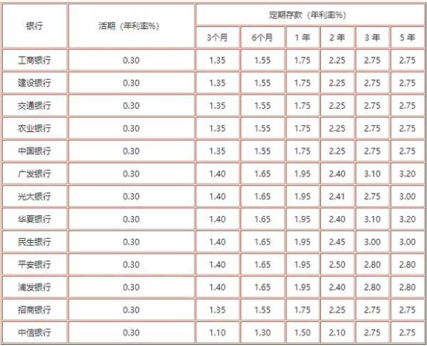 1. 活期存款:银行,农业银行,建设银行,银行,交通银行都是0.3%,央行(银行)是0.35%。