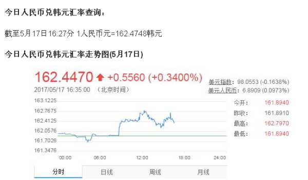 3、货币兑换:1韩元=0.005894人民币;1人民币=166618韩元。数据仅供参考,交易时以银行柜台成交价为准。