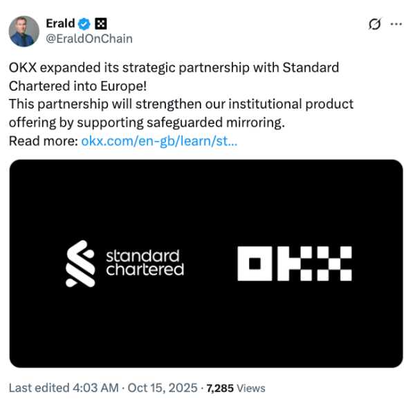 作为全球大型银行集团,渣打银行正深化与加密货币交易所OKX的合作关系,成为其在欧洲经济区(EEA)的机构托管方。