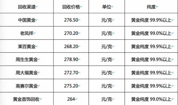 2、每日的黄金回收价格是不一样的,一般来说是在两百二十到两百六十之间一克。其实周大福、老凤祥等大品牌的黄金首饰,在回收价格方面,其实没有任何优势的,在同样的成色下,和其今天黄金收购价格他小品牌的黄金首饰回收价一样。