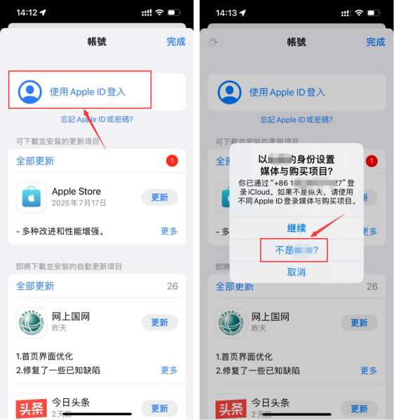 10、然后在最上面这个apple ID登录的地方重新点击一下,选择不沿用老账号进行登录。