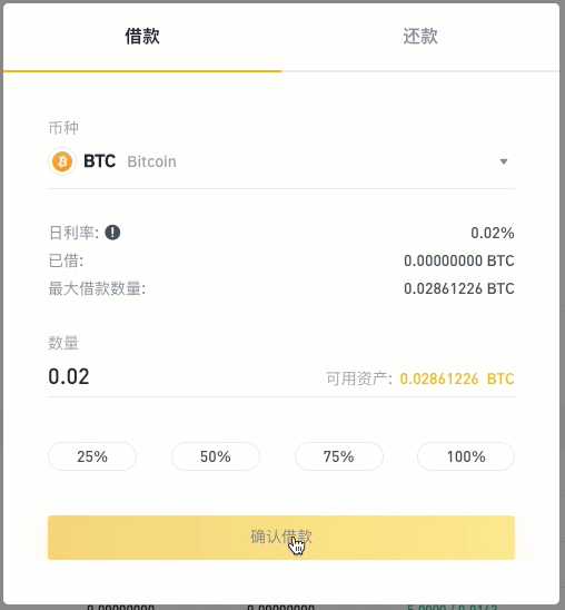 在向您的杠杆交易钱包中汇入BNB代币后,您就可以利用这些代币作为抵押进行借款。杠杆交易钱包中的余额决定您可以借款的金额,也就是按照固定的比率3:1(3x)来进行借款。所以,如果您拥有1BTC,则您就可以再借2BTC。在本例中我们将借款0.02BTC。